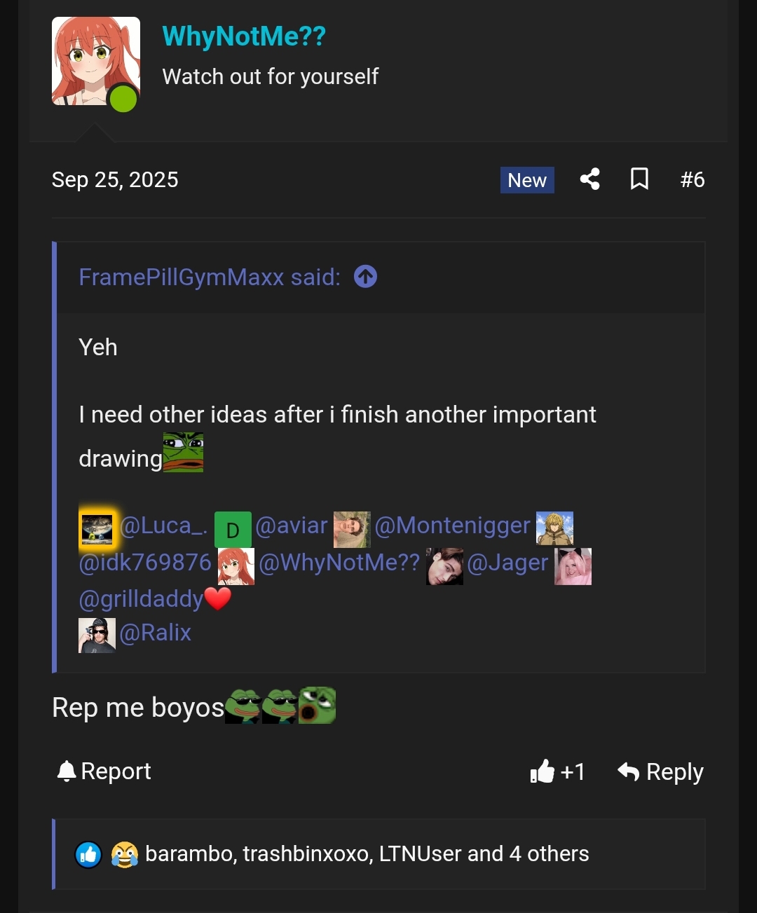 "At the end of the day, the “repfarm” narrative is just cope for those who don’t get repped often. Instead of wasting time speculating about who repped who, focus on improving your posts, your analysis, and your value here. The system rewards contribution, not complaints."