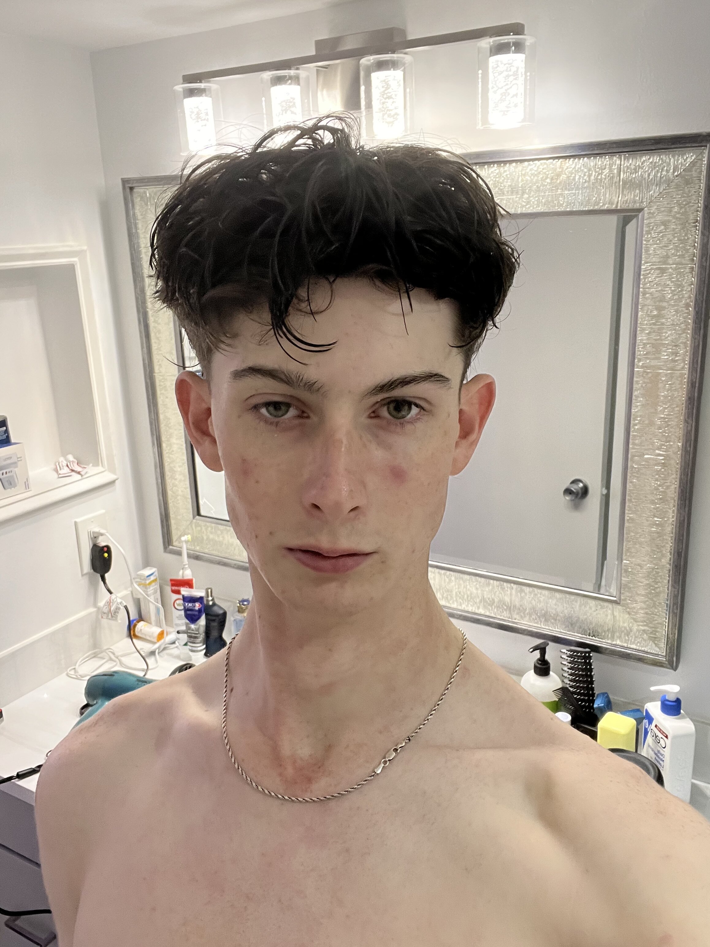 work on frame and posture, long neck off putting so hit shoulders, ur shoulders should also be rolled backwards not slouching. if ur taller you may be slouching down to others’ level, or maybe just shooting for a more relaxed look but i wouldn’t. one eye is puffy, avoid sleeping on your side or put a spoon in the freezer and run it over in the morning to reduce the swelling