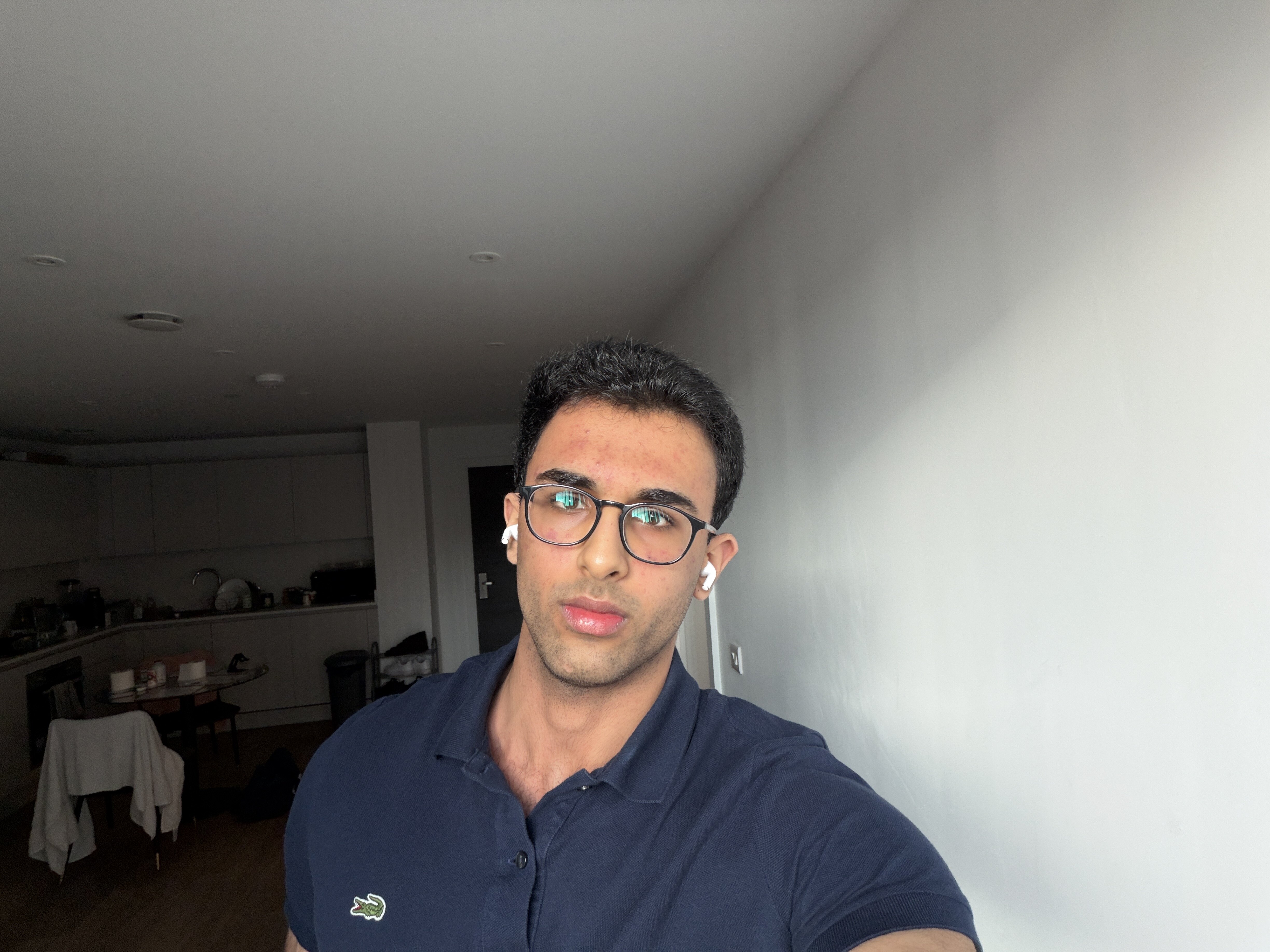 Active cystic acne with atrophic ice-pick/rolling scars across forehead, cheeks, and nose bridge (destroys skin quality and healing potential); bulbous wide nasal dorsum, rounded tip, weak supratip break, and flared base (kills sharpness and makes you look more deathnic); flat midface with zero zygomatic projection and subtle infraorbital hollowing (no cheekbone pop or under-eye support); neutral canthal tilt, average orbital depth, slightly open/rounder lids with no strong brow overhang (eyes sit “flat” instead of deep hunter); soft rounded gonial angles with average chin projection (jaw lacks the wide square flare and definition); overall decent FWHR and lip fullness