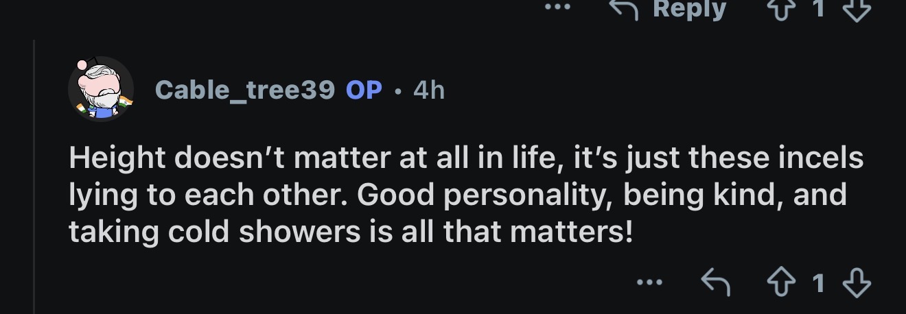 that alone will cover a lot for mental stability as you’ll go from being height mogged by women to slightly height mogging them