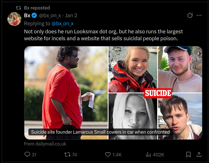 She believes that the reason why we tell each other to get surgery and inject peptides and bonesmash is not because we autistically think it's optimal, but because we are trying to groom each other into hurting ourselves, very inline with what people at SS and the retards at 764 do.