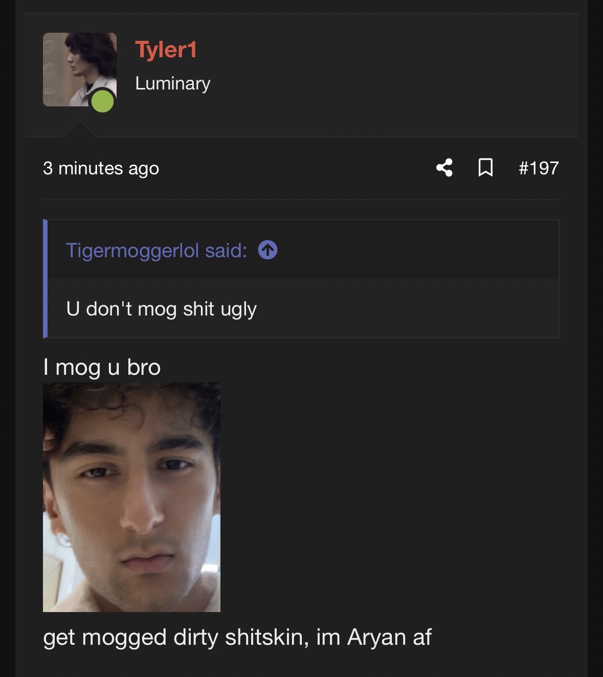 Your boyfriend is in the thread btw jflCan you please ask the mods to delete that pic of me there’s a reason why I only use Imgur to send pics instead of uploading now I wiped my face from this site when you search my name + looksmax it doesn’t come up now