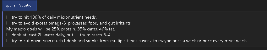 My macro goals will be 25% protein, 35% carbs, 40% fat.
