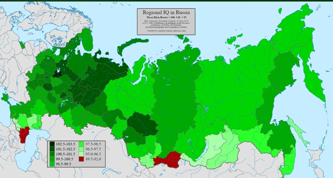 As expected tuva and east caucasian groups pull down the average by alot. My speculation was correct that average Russian iq and belarussian iq is basically the same (highest in Europe apparently? Maybe after Finland afaik) I'd like to see this broken down even more to ethnic groups but it's unnecessary as all the highest iq regions are close to 100% russian or are big centres for high iq people (moscow) I'd like to see Moscow's iq broken down by ethnic cgroup tho as there is alot of tajiks and people from the low iq regions.