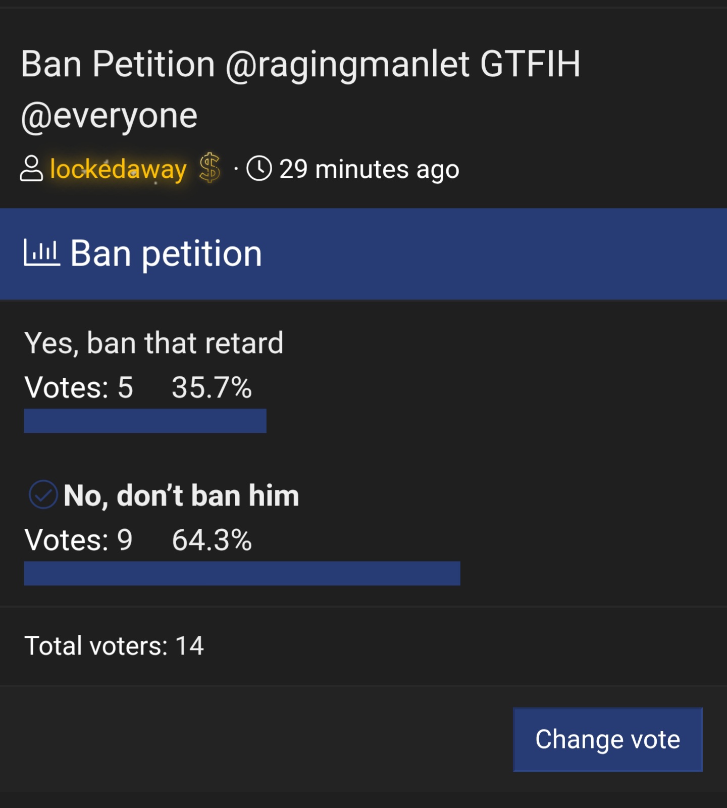 if yes then feel free to vote “don’t ban him” in the poll