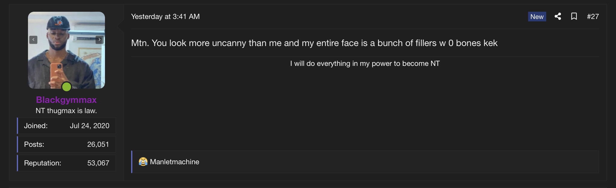 don't talk shit about BGM, the guy is beyond reason. Treat him with due respect like you would a crippleThis retarded ass dude thinks anyone will look up to him from his irrational ratings obtained merely from the cohesive dating apps he is on all day while LDAR'ing..