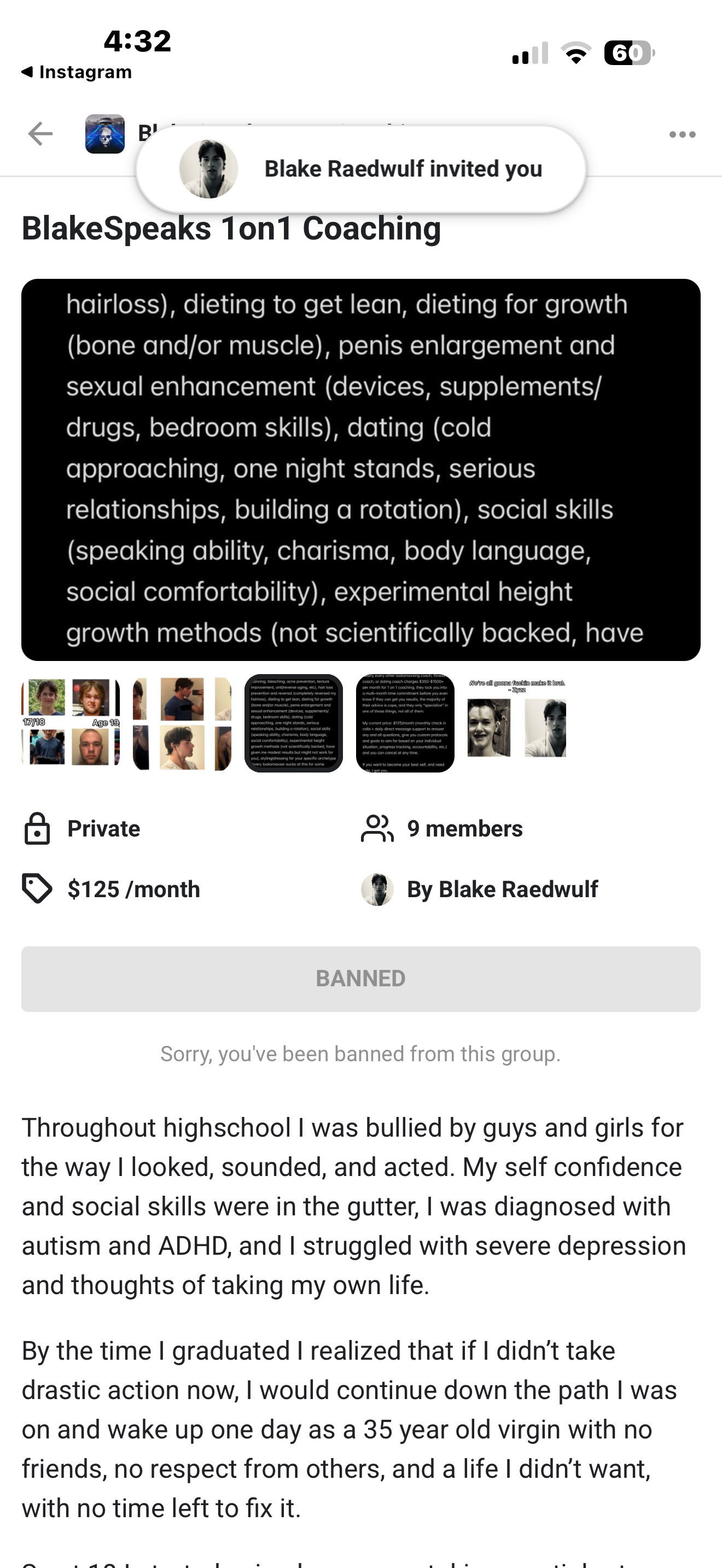I'm 15 and idc if you think it's retarded for me to buy a course or not. There is so much over information and I just wanted a 1-1 coach that could help me from my specific standpoint and I heard he had knowledge and was smart. I checked out his Skool and it didn't say anything about being 18 and I bought it, he did a call with me and talked to me for like a day on a hormone protocol. He then texted me the next day and said he couldn't help me with hormones further since I'm under 18 and was like alright and I like asked him again and he said if your parents are okay with it then sure whatever. So I like told him my parents were fine with it and I never heard back again I got blocked on Instagram and from the Skool group 😭 no refund $130 down the drain. He's now updated the Skool to say 18+ after that, it's just annoying.