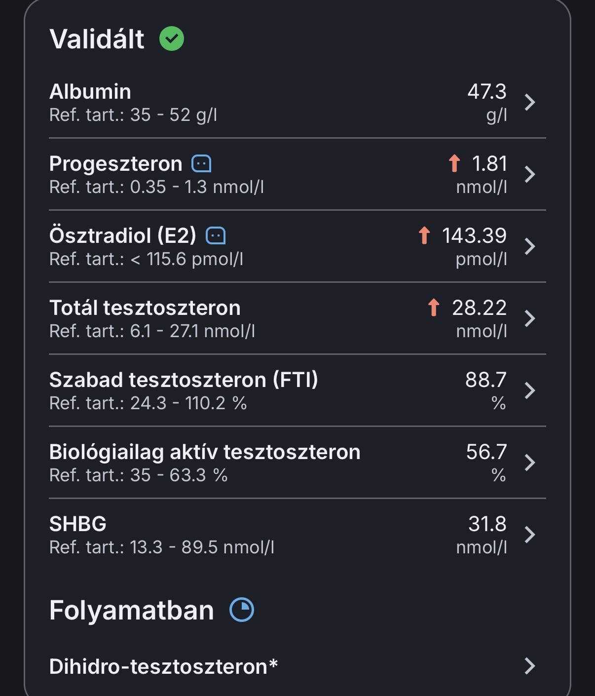 Total Testosterone: 28.22 nmol/l ↑ (ref: 6.1-27.1)