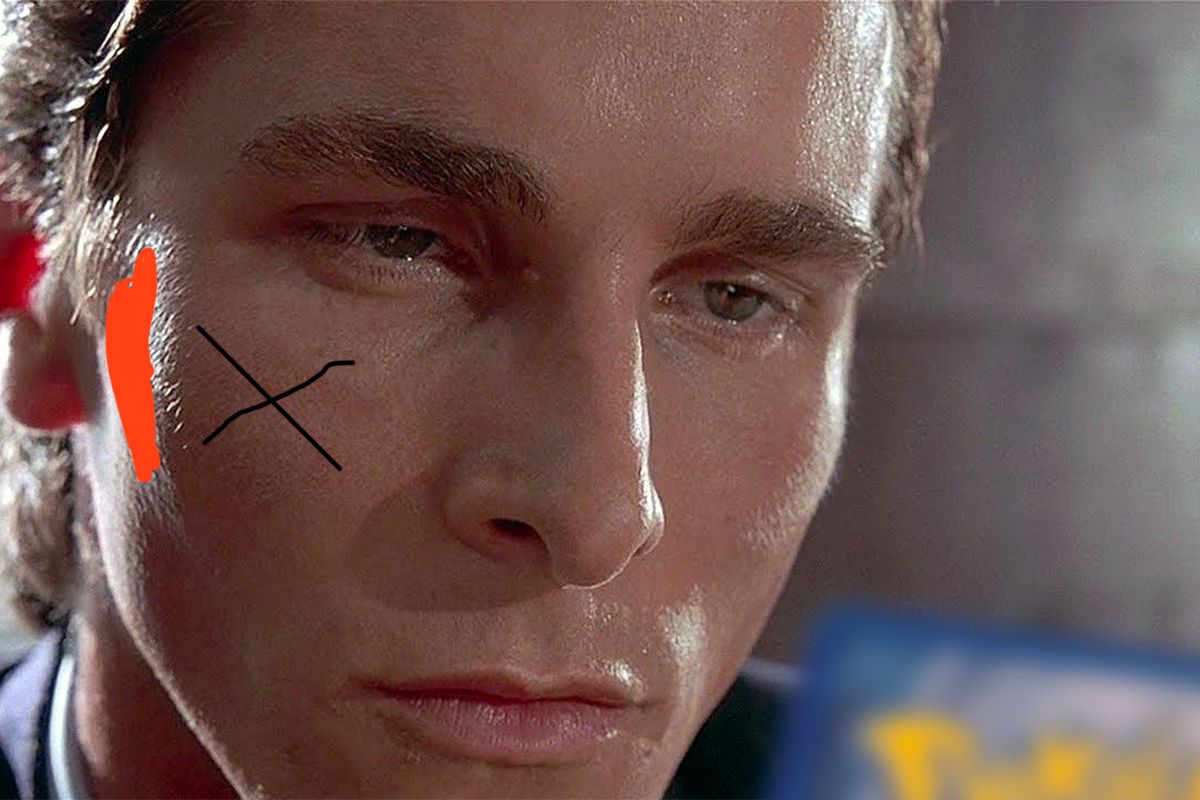 The part on christian bale i shaded red is the part you should hit, not the black x because hitting the x will lead to decreased collagen from tramua and saggy skin.