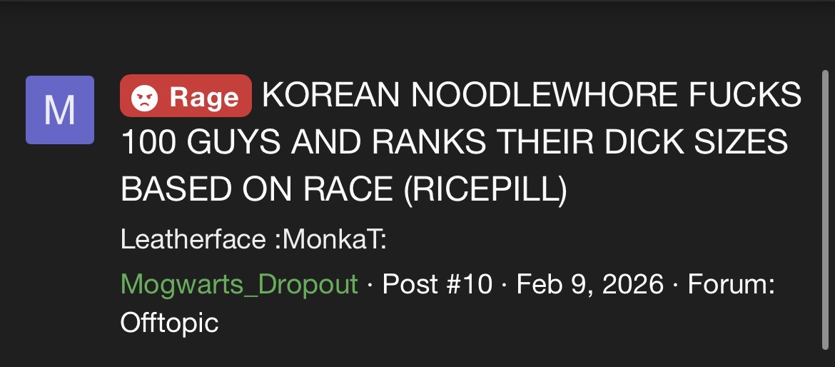 Im pretty sure he's well known in Asian supremacist servers.This nigga mogwarts prolly created a war in china from his race bait threads that killed 60 million people and created a famine that’ll last until 2668 and he died along it cuz why hasn’t he posted in so long