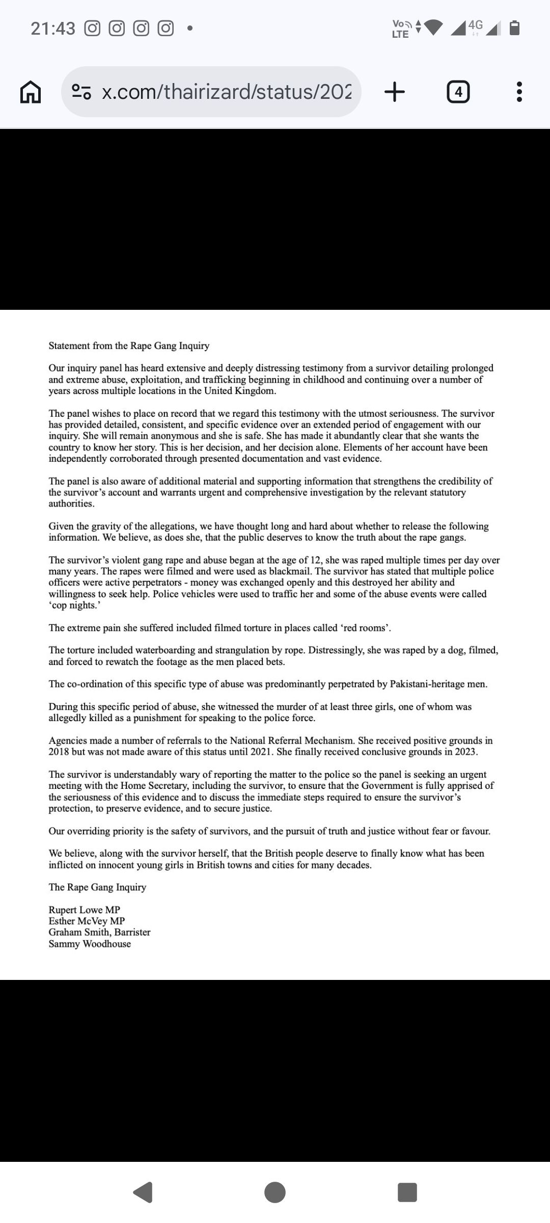 This is a statement from the investigation into the rape ring. The UK rape ring case is 100 times worse than the entire Epstein operation. The reason this is being suppressed by the British media is that full transparency at this point would lead to a revolt, the expulsion of all Muslims from England, and the death of journalists. A 12-year-old girl. Tortured. Filmed. Raped by a dog while men placed bets. Police involved. "Police nights" as events. Red rooms. Murder. And conclusive evidence kept secret for years. The ignorant media. The system was opened. The names are of men of Pakistani descent. The accomplices are British institutions from top to bottom.