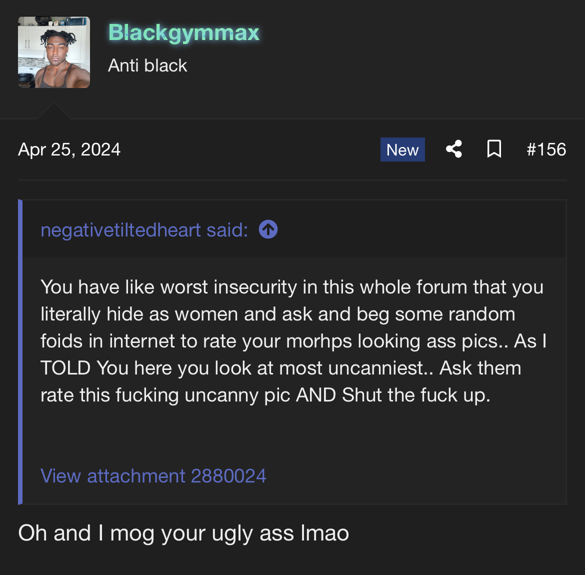 @Blackgymmax wakes up as usual. After taking a big shit it’s finally time to start browsing on org and start bullying children as 27 year old “grown” man.