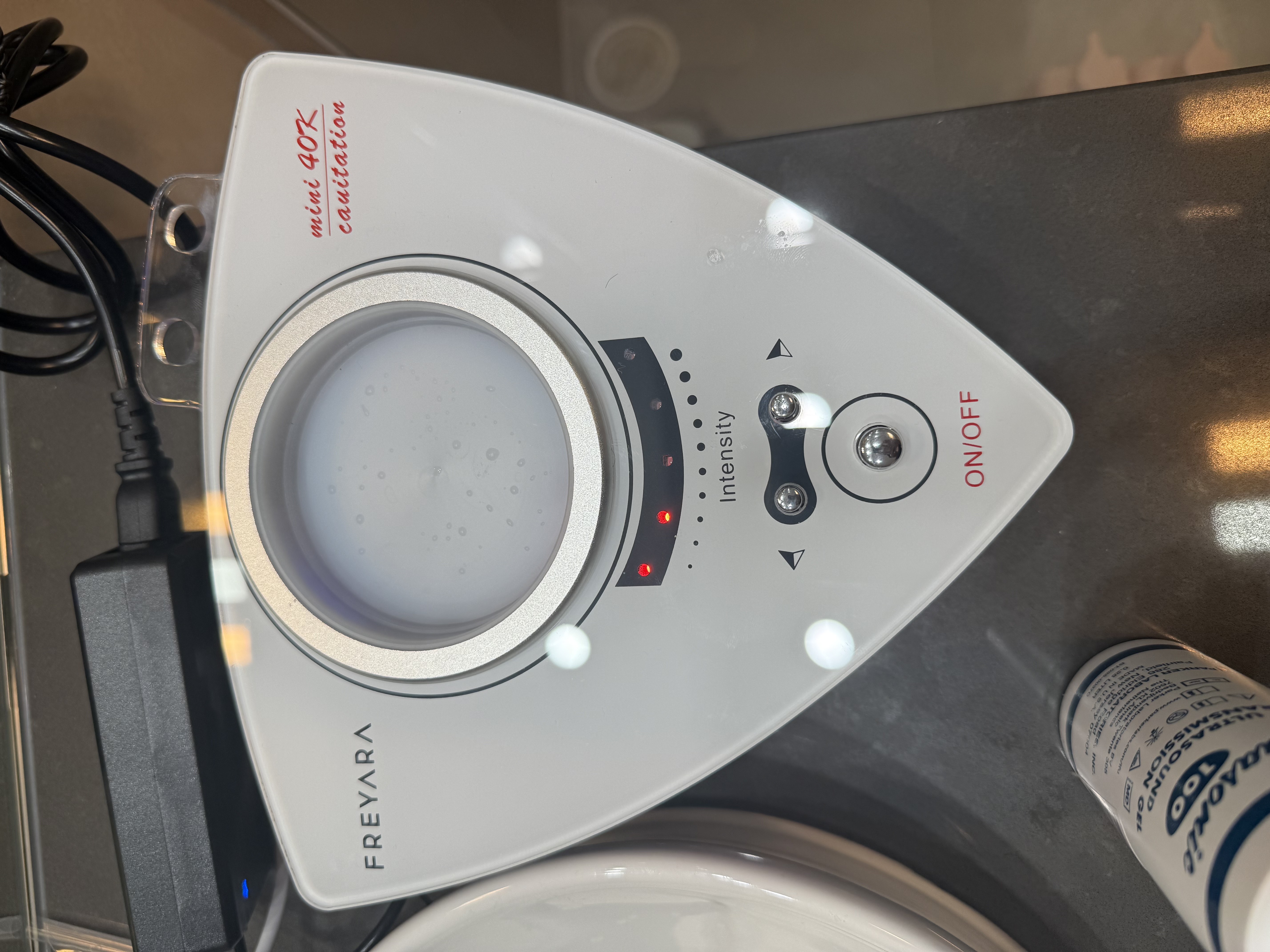 The Freyara machine had 5 intensity levels in total. I started with the first / lowest level and will progress in intensities as I do more sessions. As you can see I had the machine on the lowest intensity and its cavitation effect on water was as shown.