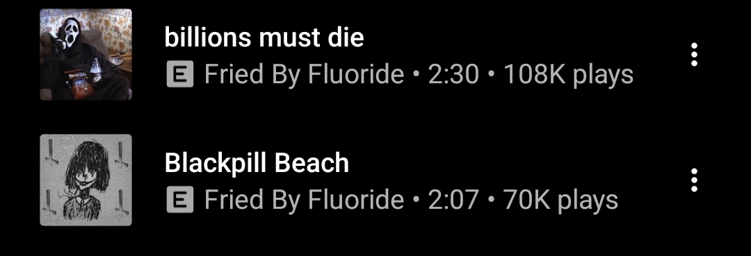 Even tho the only song that is actually popular is "the love i lost" which peak popularity was in late 2023 and early 2024 continuing being relevant even today, the band fried by fluoride is an incel band, they literally have songs as "blackpill beach", "billions must die" "incelcore star" (attachements down below) and many more songs like these