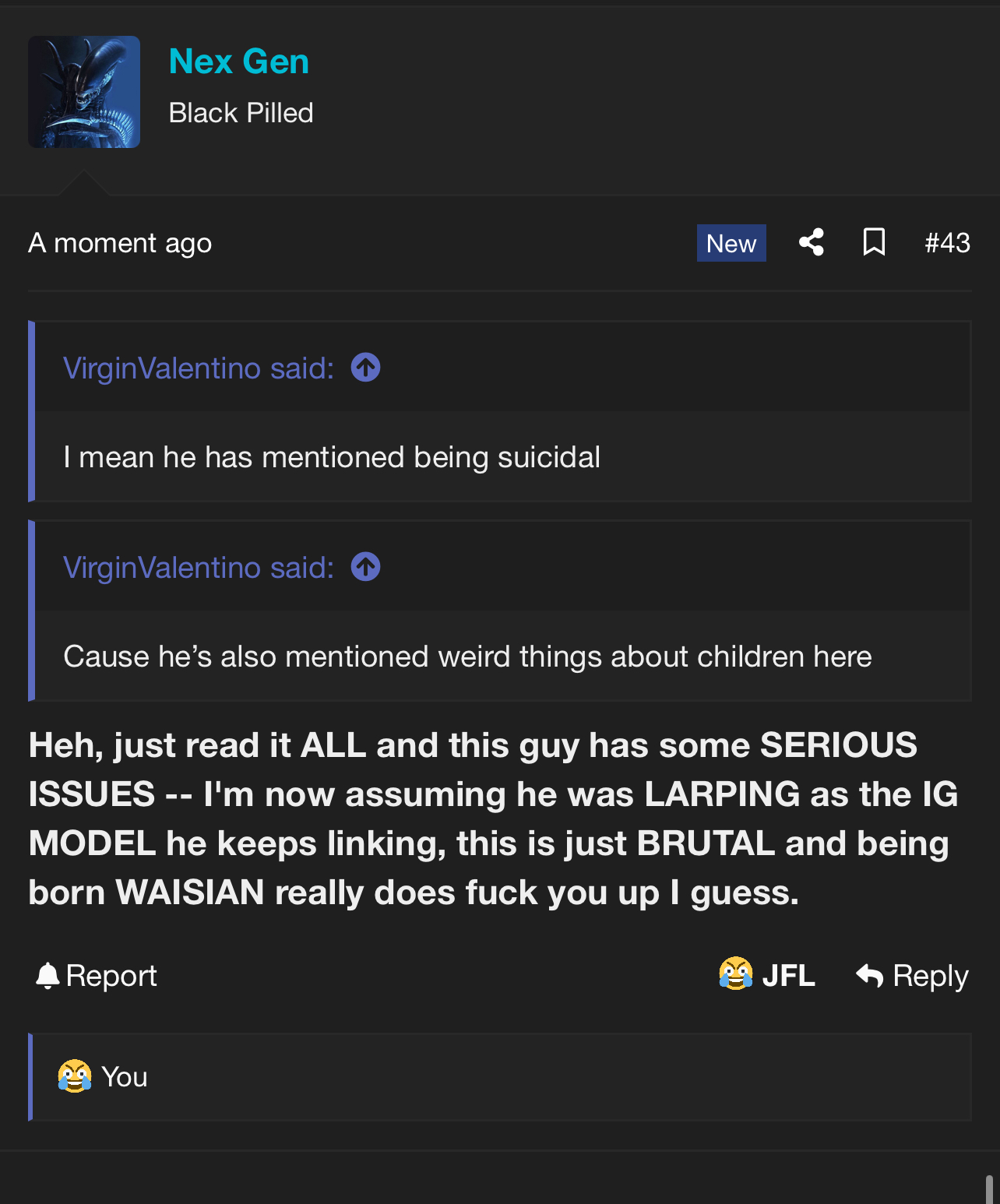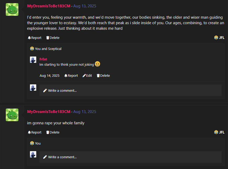 Now he's larping about his height and claims he mogs me (retard)