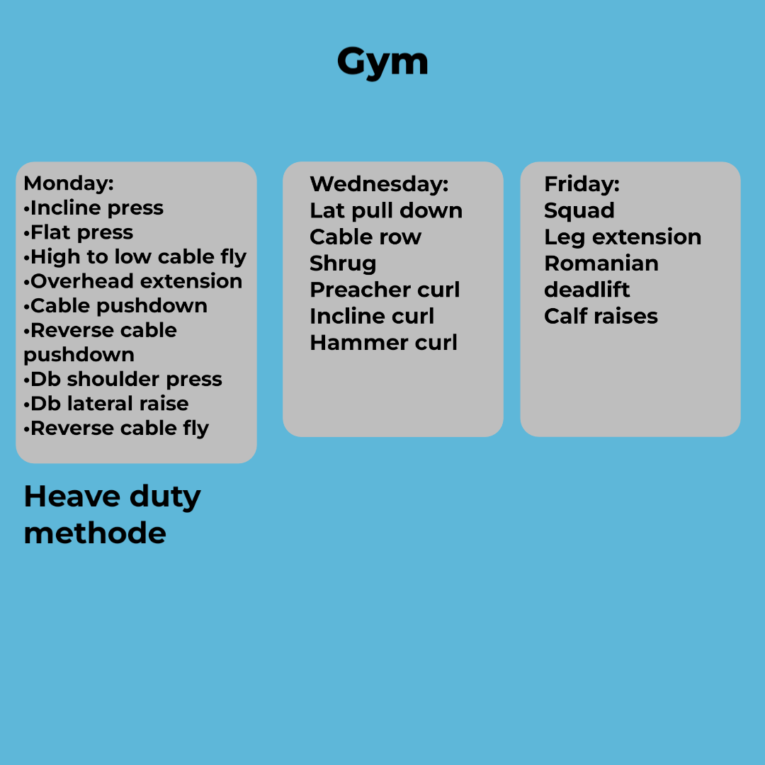 I only have 3 days to exerciseI don't think that this is good. Look, if u wanna do heavy duty, u need less excercises. Anyways, I don't really recommend u that cause, besides what Mike Mentzer said, u only do frecuency 1 a week, or even less if u do it the right way. I'm saying this cause I tried it, and I'll tell u what. I've seen the better results since I started doing this: