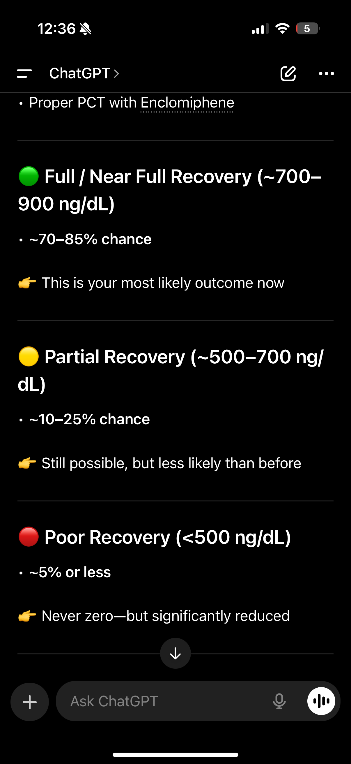 Here’s what chatgpt had to say, for reference my natural testosterone is 797, so a recovery to 900 would be above baseline.
