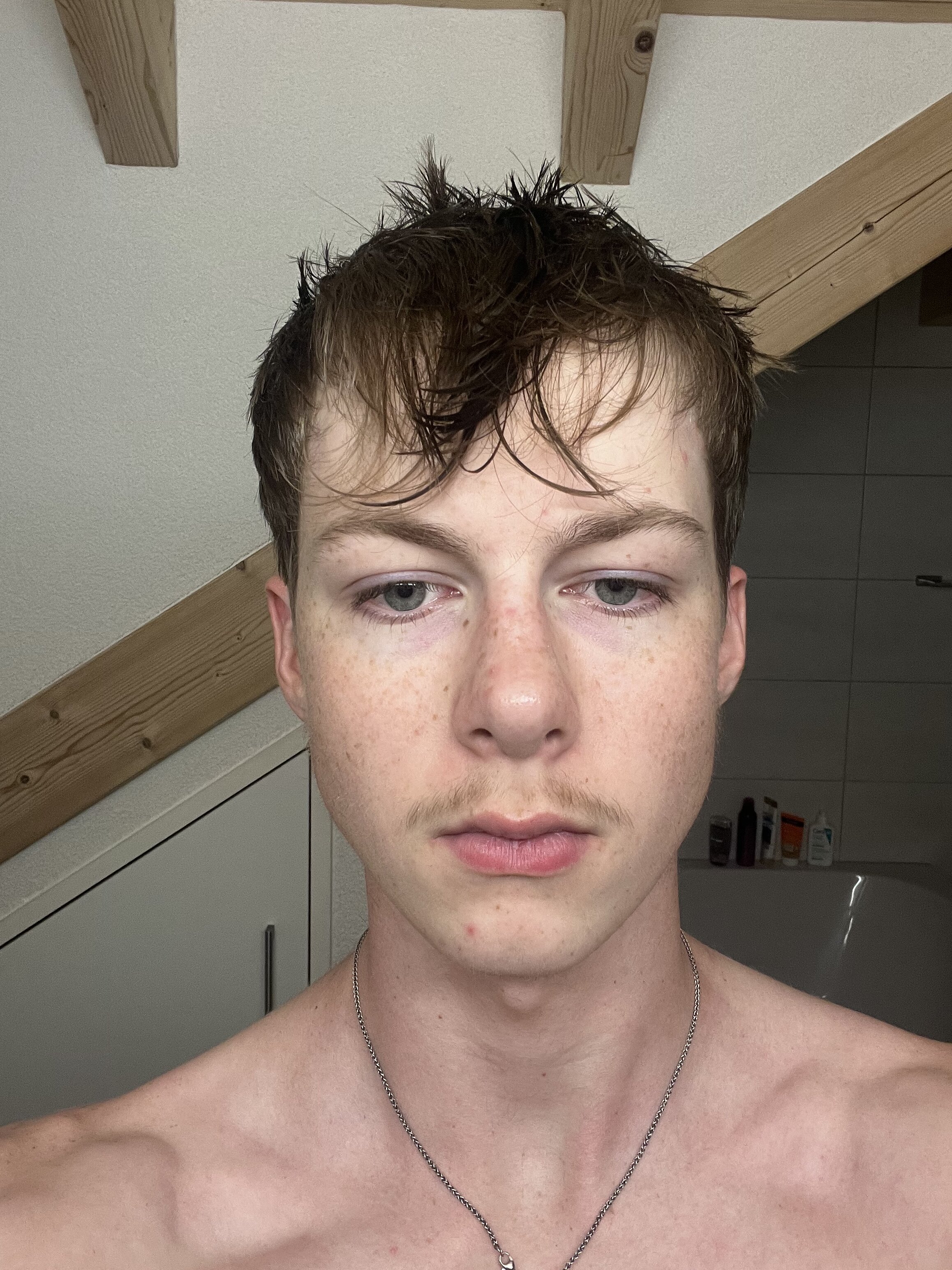 holy upper third, try thicken your eyebrows and possibly dyeing them a darker brown?, shave the facial hair, grow the hair out and debloat also try and cut sodium/processes sugar intake to reduce inflammation in your nose