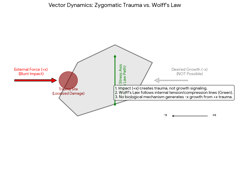 The misconception: Wolff's law states that a bone will adapt via bone density along with some minor shape changes under constant load over time, not from hitting the bone randomly, While Wolff’s Law explains how bones adapt to functional mechanical loads (like walking or lifting weights), it does not apply to blunt force trauma like bonesmashing. Cyclic stresses like chewing or orthodontics can subtly remodel them as per Wolff's Law, as seen in the functional matrix theory where soft tissues guide skeletal growth. we cannot strike the bone in +x direction and expect growth in -x direction. For example orthodontic devices exert constant force for several months for bone re-modeling (not extra bone growth) to change the shape of the existing bone (Wolff's law requires mechanotransduction—the process where cells detect tiny fluid movements within the bone caused by normal bending and compression. Blunt trauma in the (+x direction) . The body replaces the soft bridge with brittle, unorganized bone (woven bone), which often feels lumpy and lacks the strength of normal lamellar bone, and is not pronounced enough to appeal for aesthetics. Fibrocartilaginous Callus: The body builds a soft bridge to stabilize the trauma site from bonesmashing, The woven bone usually gets reabsorbed from the RANKL pathway which I will explain in the next section 'Subperiosteal hematoma ossification'.