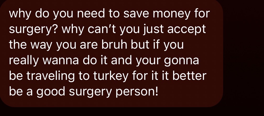 I don’t even think it’s that I feel like they are jsut fearmongered into believing surgery is bad and only think of botched casesTHEY DON'T WANT YOU TO ASCEND