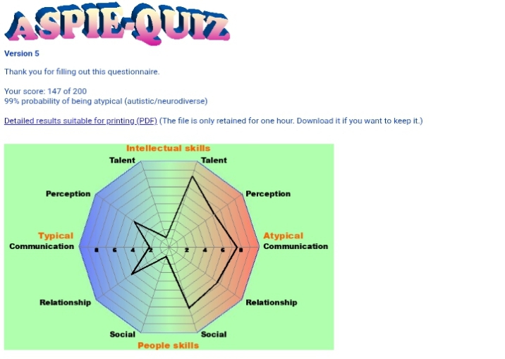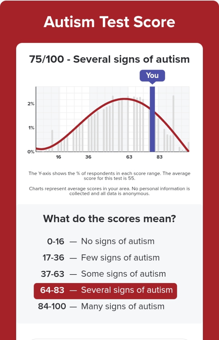 i was researching autistic traits for days and discovered 70+ of them relating before taking tests, took every autism quiz like RAADS-R, Autism Quotient, Aspie Quiz, Psychology Today, I've been scoring as high as autistic individuals.