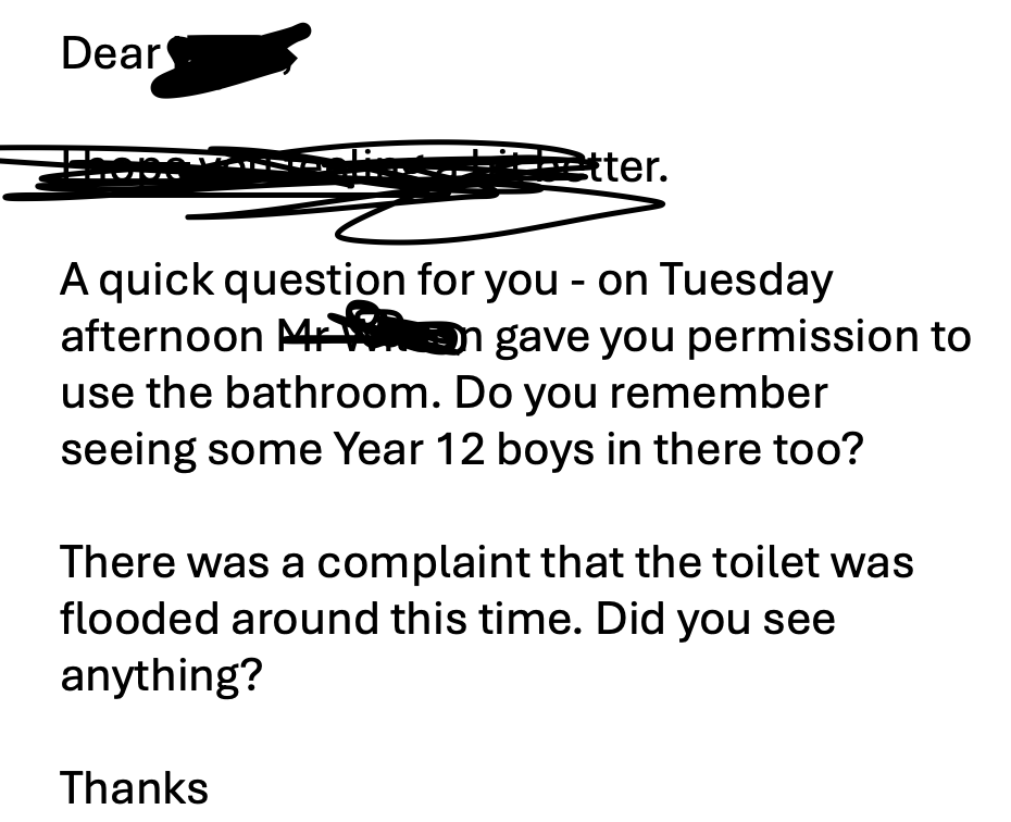 at school I go into teacher toilets and don’t even aim for the toilet just piss straight on the floor it’s so fucking funny