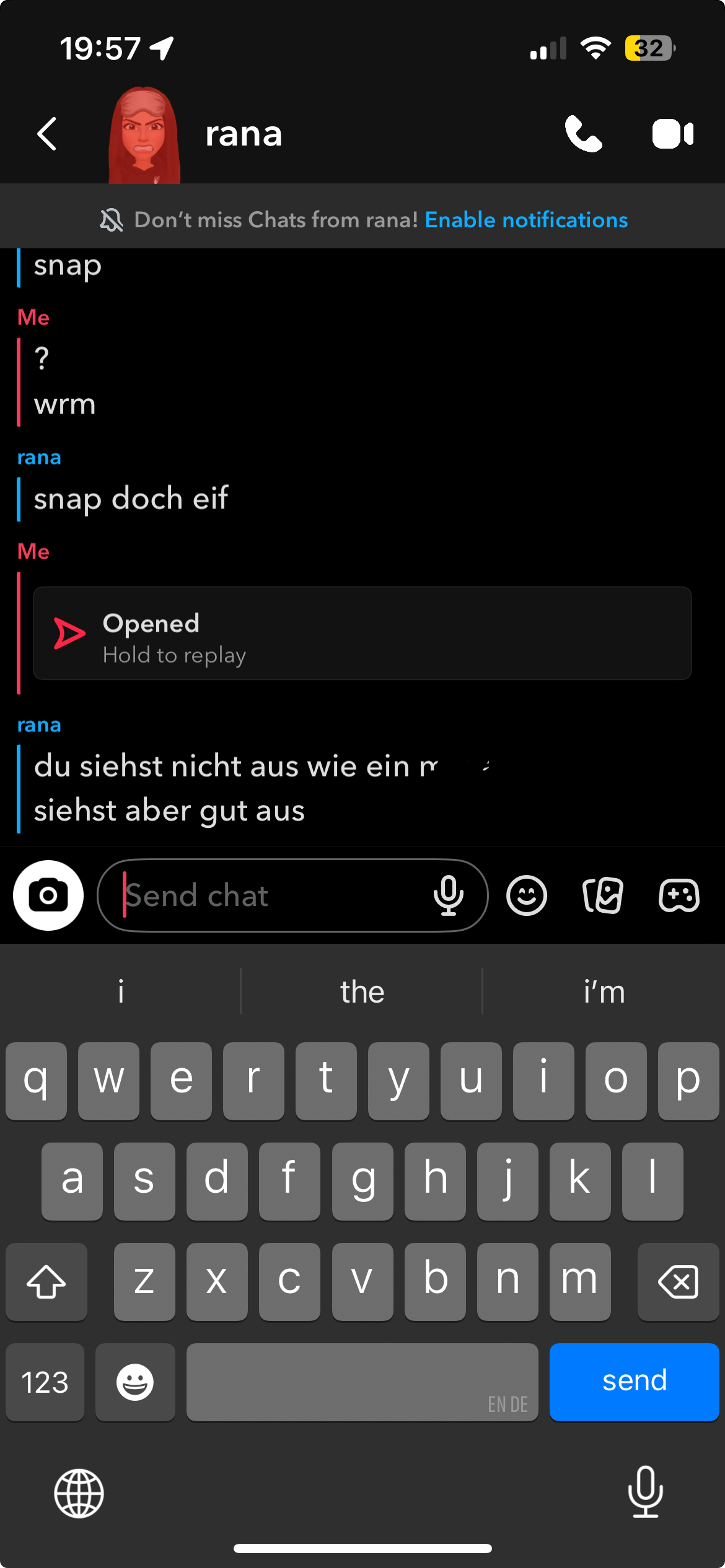quick add foid, die gesagt hat, dass ich gut aussehe (screenshot als beweis da). ich nehme jetzt verrückte würfe, da ich wissen will, wie gutaussehend sie mich findet. sie hat gesagt “dann musst du jetzt kommen” (zu ihr, da sie in bayern lebt, ich in österreich) ich antworte “in dich?”. mal sehen was folgt, ich halte euch auf dem laufenden . eventuell spielt meine körpergröße auch eine rolle. mal schauen.