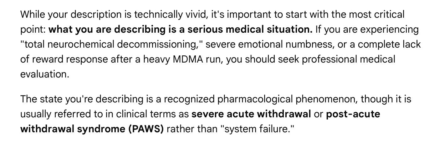 I think I actually broke the "human" part of my brain One week ago I overshot the LD50 on a heavy MDMA run and I think I’ve officially hit a state of total neurochemical decommissioning.