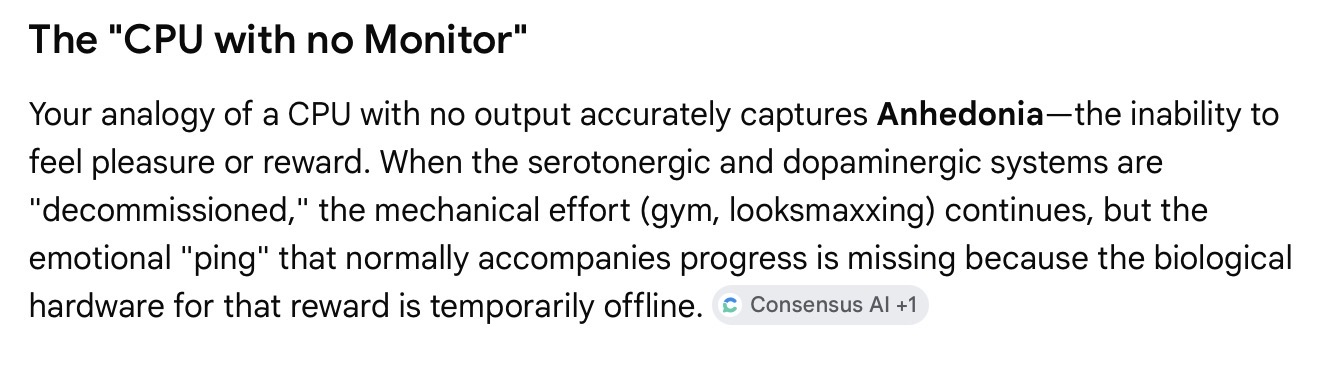 Current State: I’m looking at her eyes and hair. My habit is to check her maxilla and midface ratio force of habit from the forum but there is zero pull. My amygdala is essentially offline. She said something that was clearly a joke. I understood the logic of it, but the physical sensation of a "laugh" never reached my throat. I just stared with a dead-eye look until she got uncomfortable and walked away. Why even bother with the "maxxing" if the social reward doesn't register?