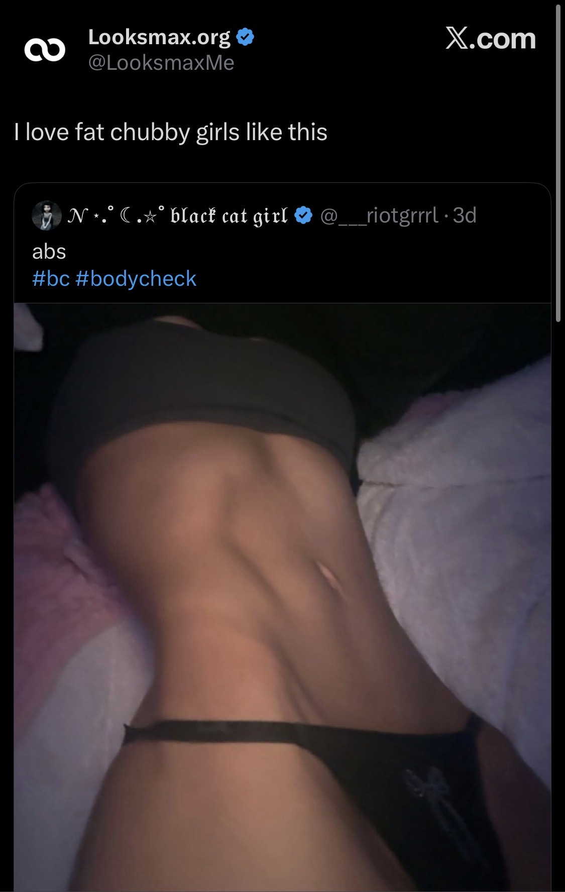 @Orka this reminds me of ur foid iclshes not even anorexic lmfao i hate women like that who post themselves laying down sucking and tensing their stomachs to look skinny.