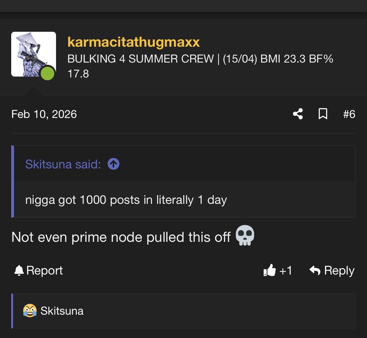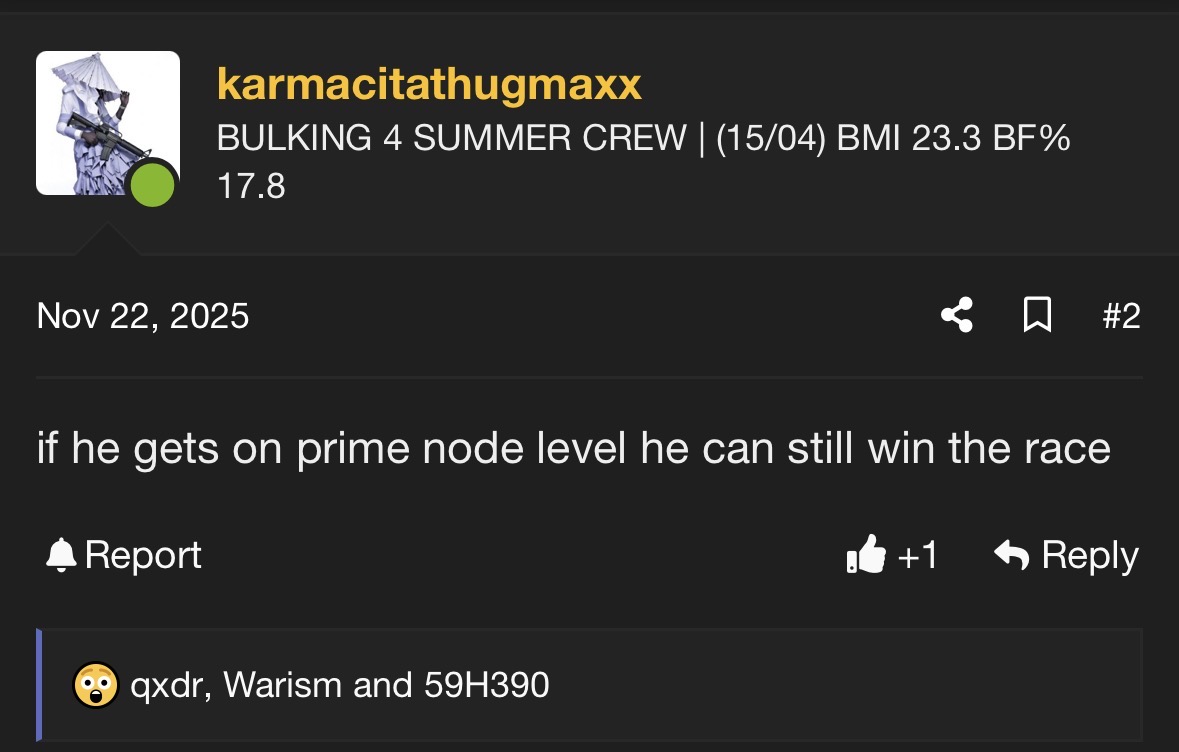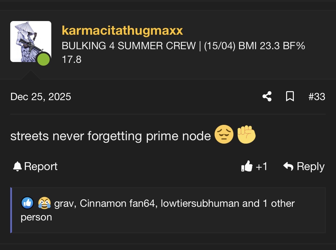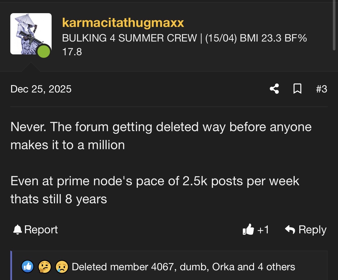 Why are you gay?Hi my name is node. I joined this forum on may 14th 2025. I had 41k posts when I deleted my first account on December 25th 2025. I came back to this forum so I could continue to mog you subhumans to death. Ask me anything!