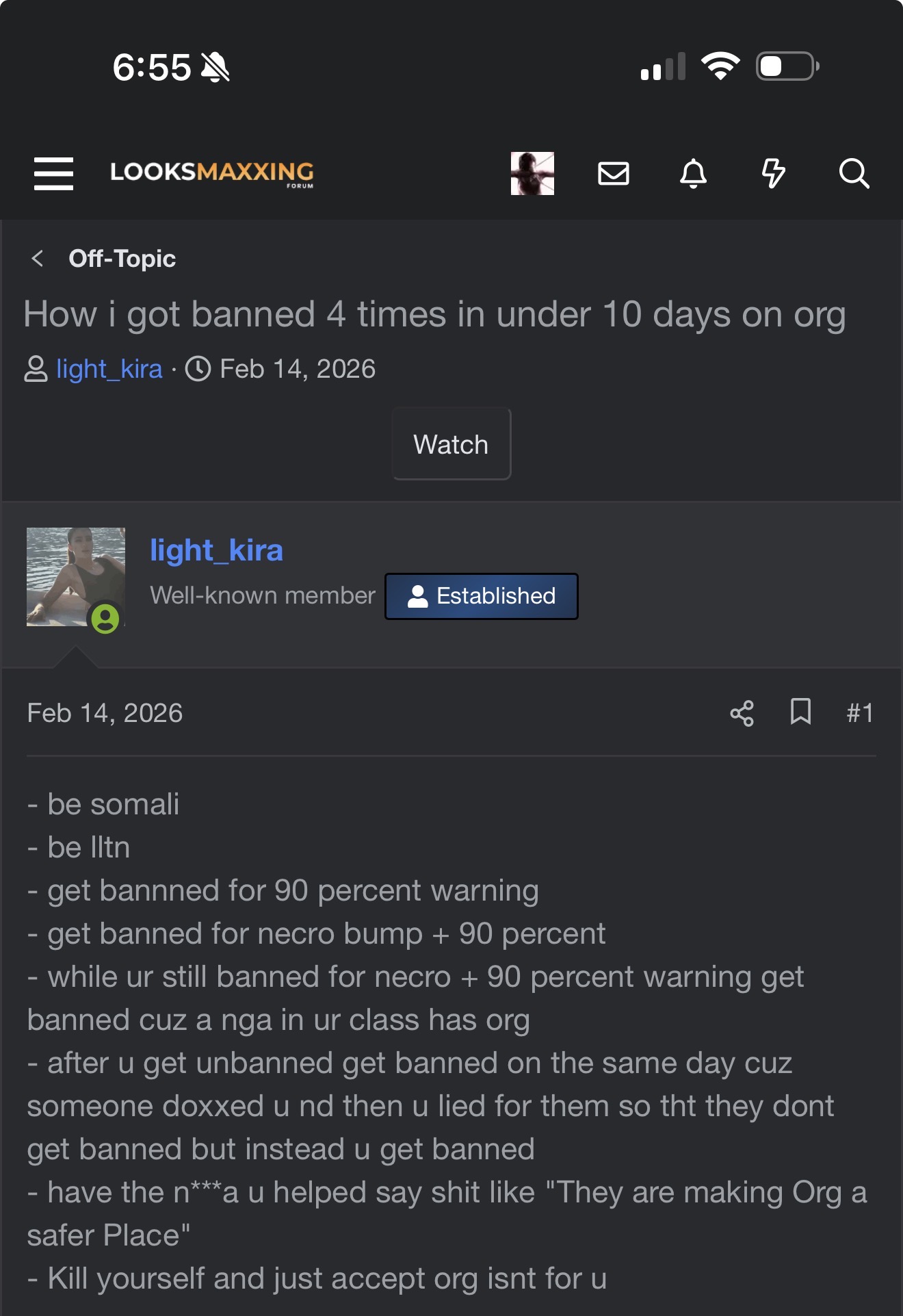 He was banned because of you. You accused him of doxxing (he didn’t doxx you) and Kira wasn’t even punished for lying to the moderators.