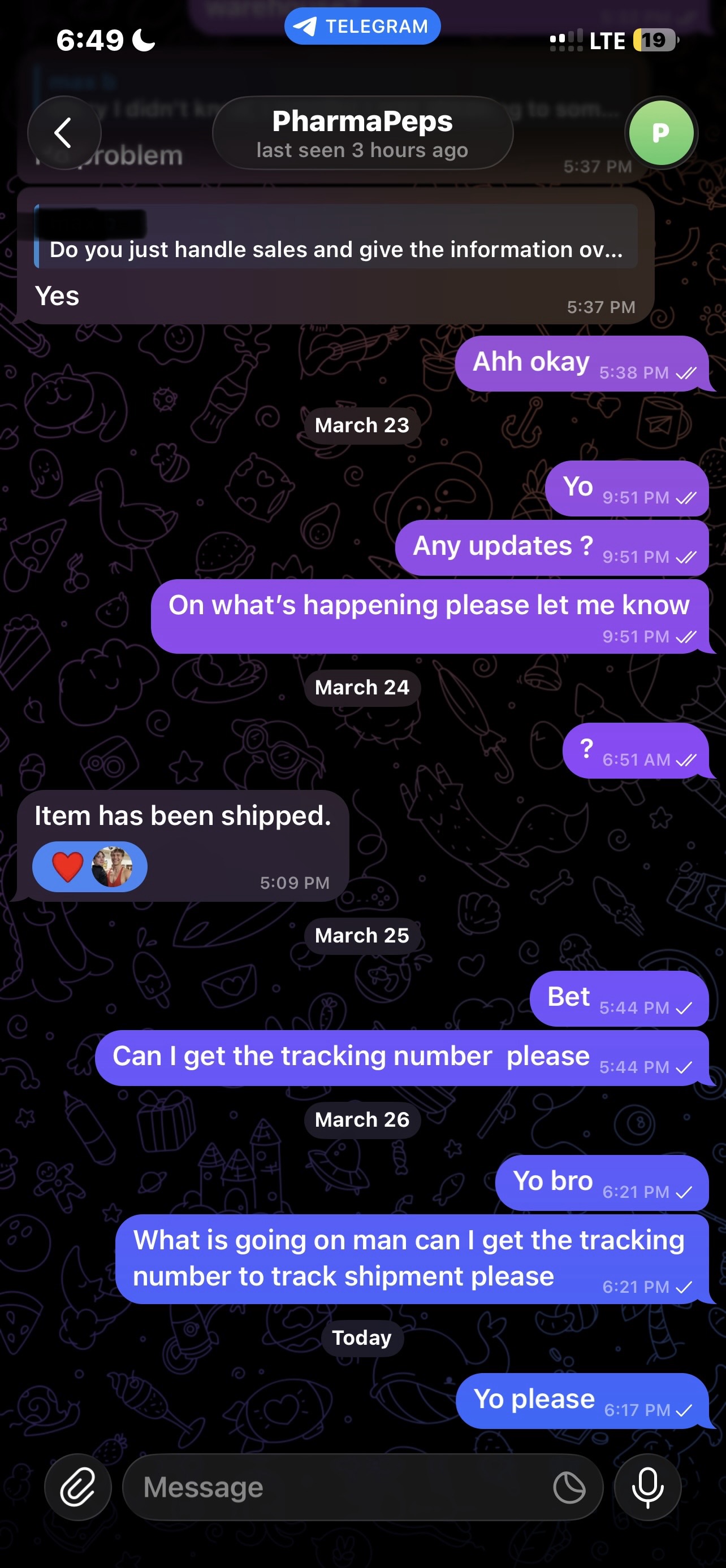 yo has anyone ordered off of “Pharmapeps” on tele. I ordered reta ghkcu and mt1 and they barely be replying. Apparently my order got “shipped” but I barely be hearing anything back; is this normal for Chinese suppliers?