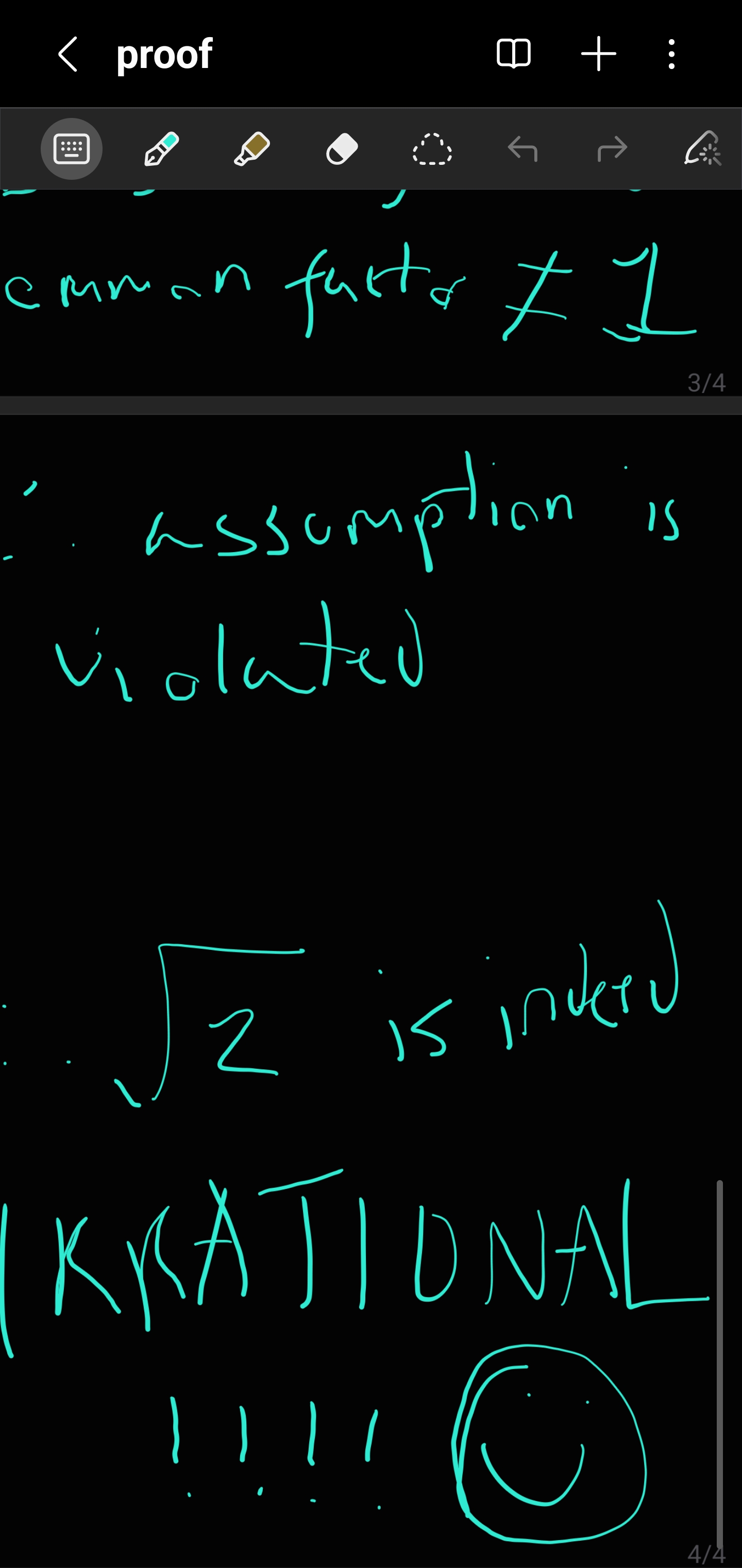 yeah ofc, this is a shorter proofI like more the proof that deduces that √2 is irrational from the fact that 2 is prime which implies that 2 cant be a square of an integer and it from the fact that that any fraction in its simplest form squared isnt an integer except if it is reduced fraction with a denominator of 1, which is a whole number and it is already proven that an integer squared cant be equal 2 and therefore there doesnt exist a rational number which when squared gives 2.
