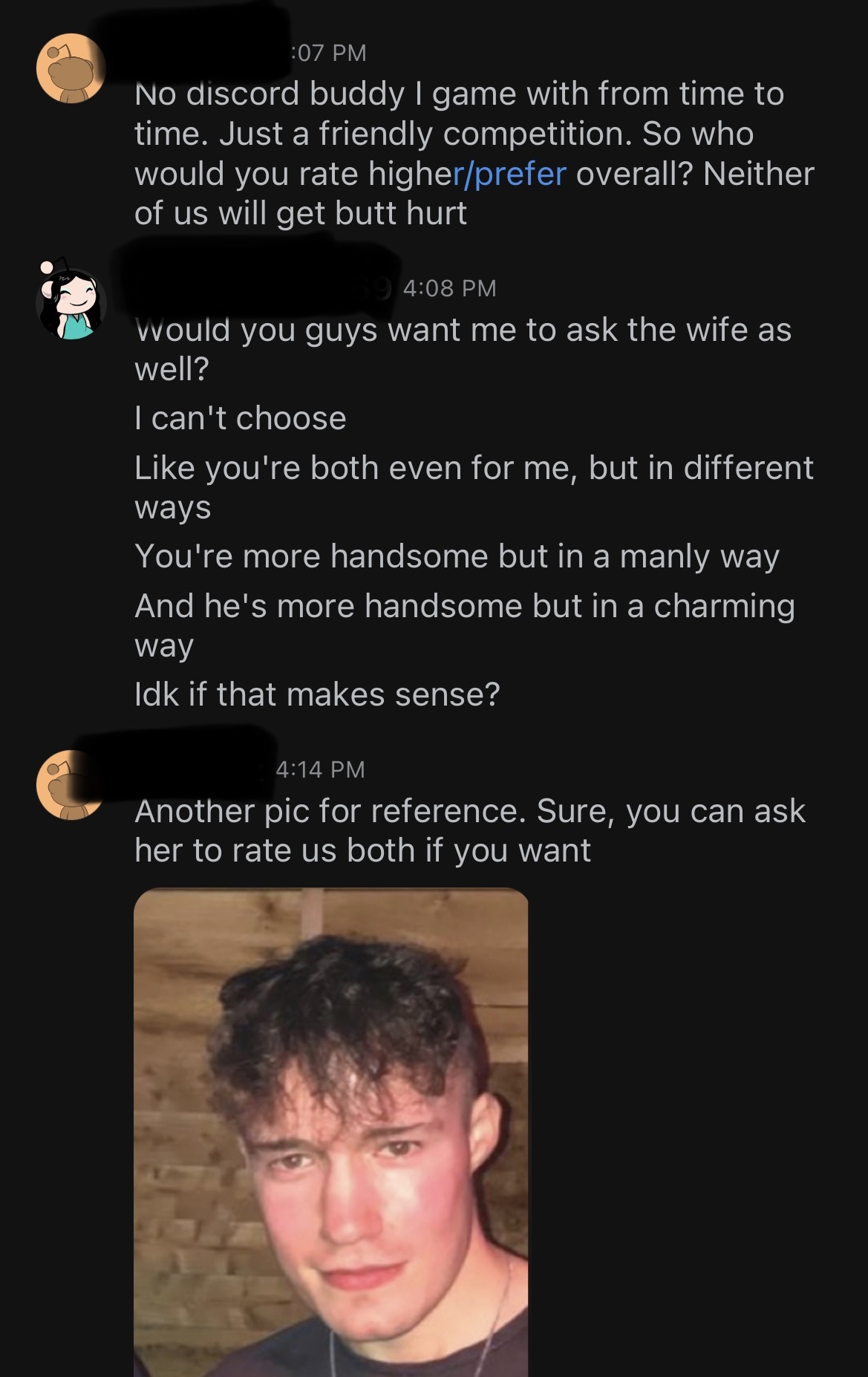She didn’t have a number. Just same thing, your cute, I’m handsome. Wife likes cute other girl like manly look