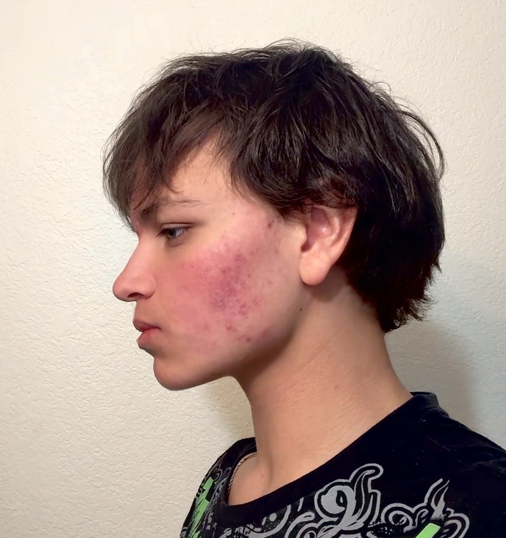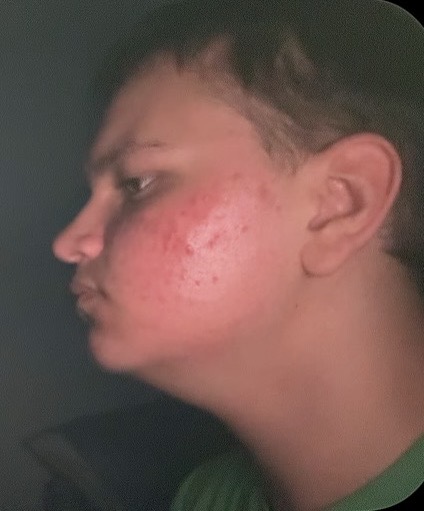 Bad acne, extremely feminine face.