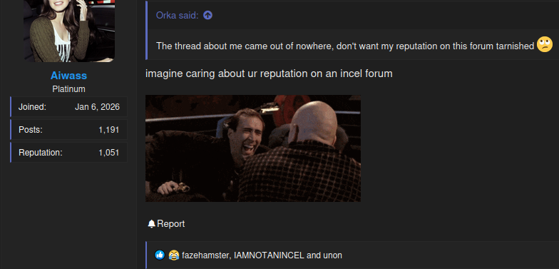 retard embarrasses himself for incel forum clout