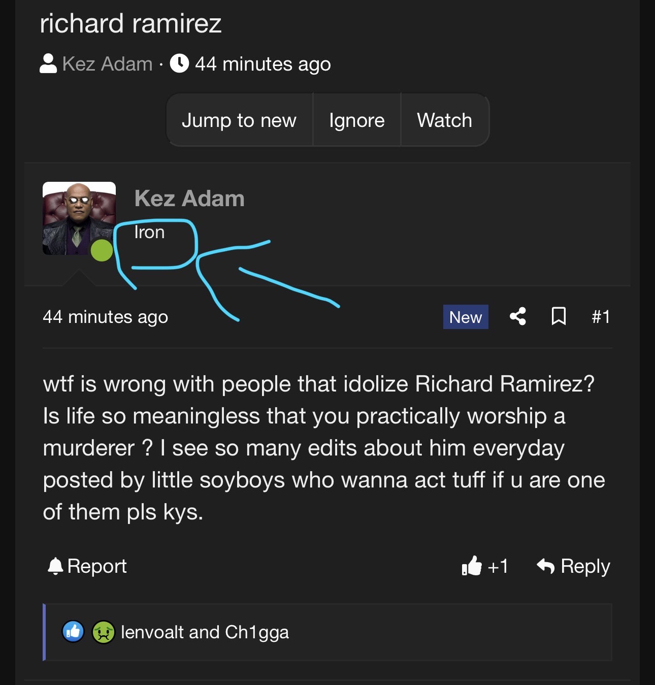wtf is wrong with people that idolize Richard Ramirez? Is life so meaningless that you practically worship a murderer ? I see so many edits about him everyday posted by little soyboys who wanna act tuff if u are one of them pls kys.