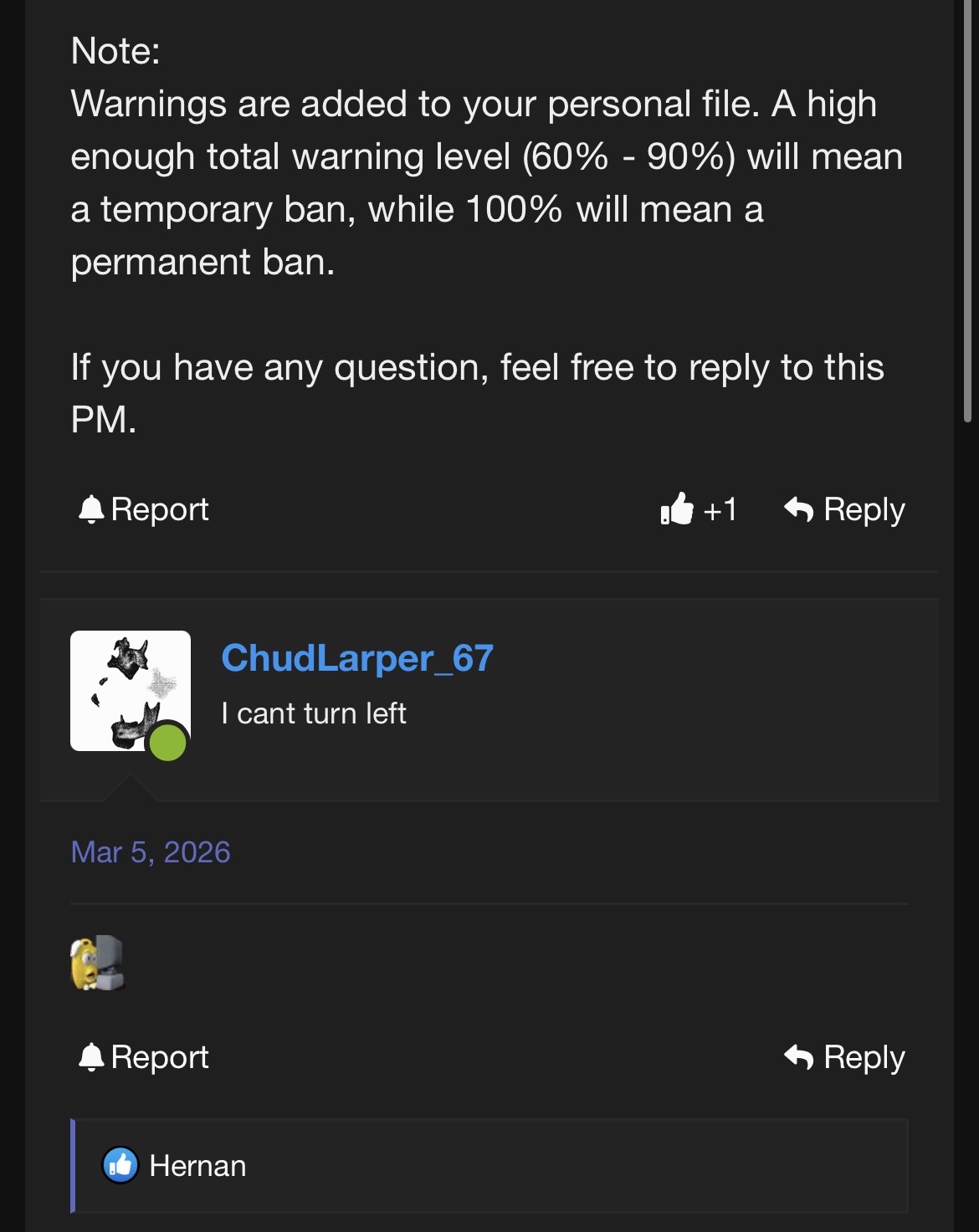 hernan cus gave me a warning once and gave me free rep