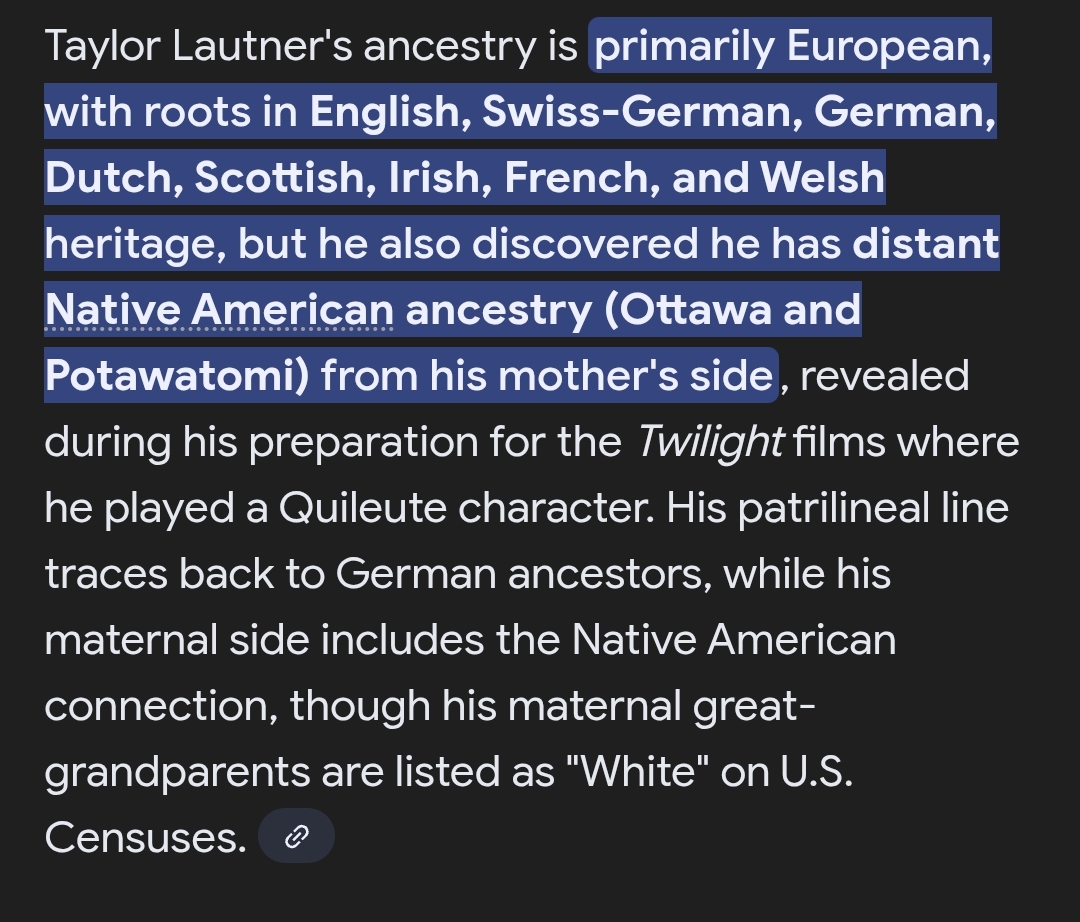 Come on, Taylor's features like little eyelid exposure were inherited from his father, not some supposed indigenous heritage. As you can see, Taylor looks much more like his father, who is totally European, since his indigenous ancestry comes from his mother.