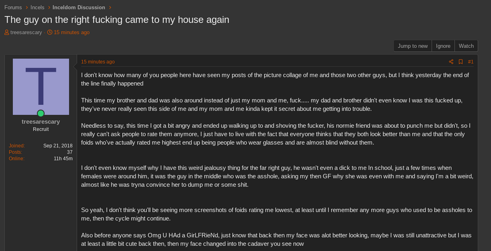 Needless to say, this time I got a bit angry and ended up walking up to and shoving the fucker, his normie friend was about to punch me but didn't, so I really can't ask people to rate them anymore, I just have to live with the fact that everyone thinks that they both look better than me and that the only foids who've actually rated me highest end up being people who wear glasses and are almost blind without them.