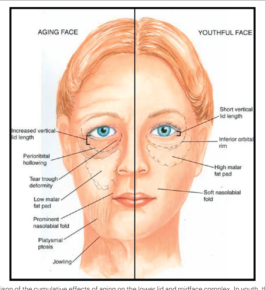 Even if the fat pads are the layer in highest up closest to the skin, the whole face is kept tight when we are young by underlying ligaments attached to the bone as seen in the pic below, the white is not bone but ligaments. Those ligaments no matter the bone come downwards and sag with age.