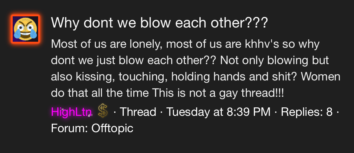He posts A LOT of degenerate shit too, talking about his dick, staying up all night to post, talking a bit too much about sucking each other off, wishing he was black and the best of all: