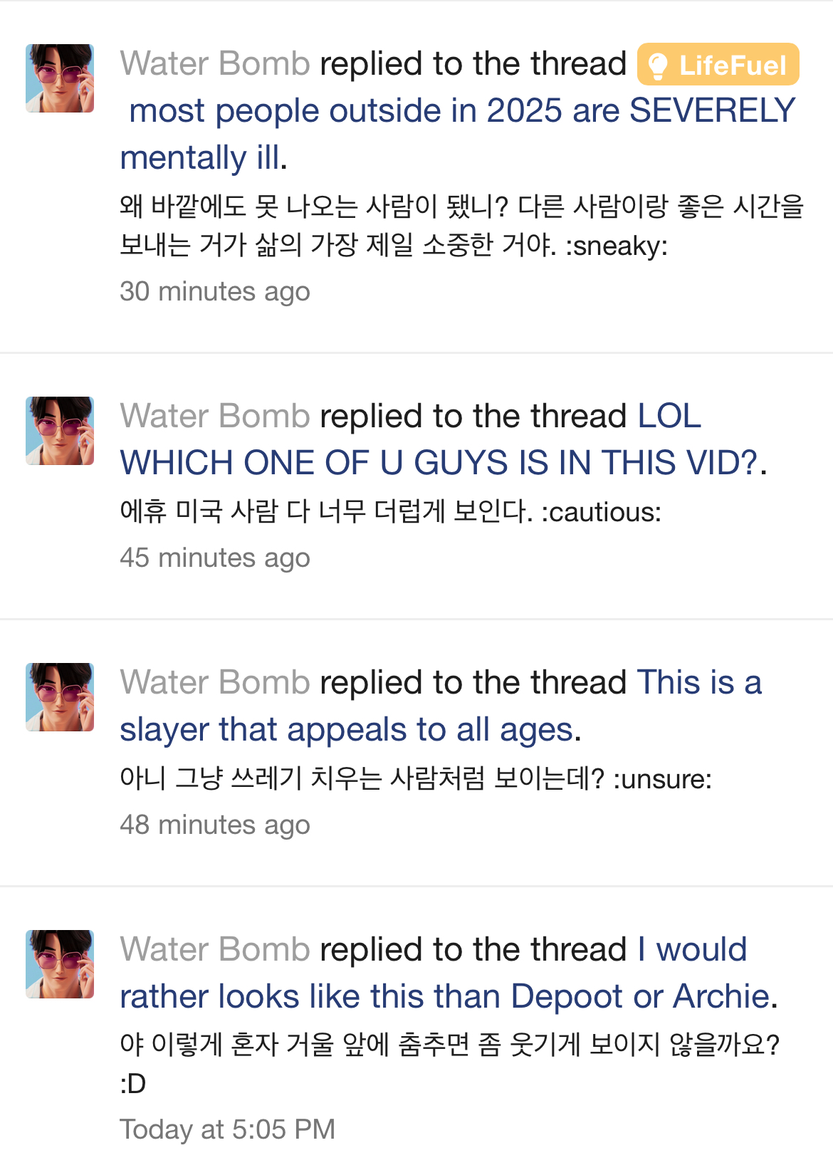 mirin, one of you is larping and i dont care enough to figure it outHe is larping I know how to speak korean the sentence structure and tone of speech is all robotic and akward all translator generated probably