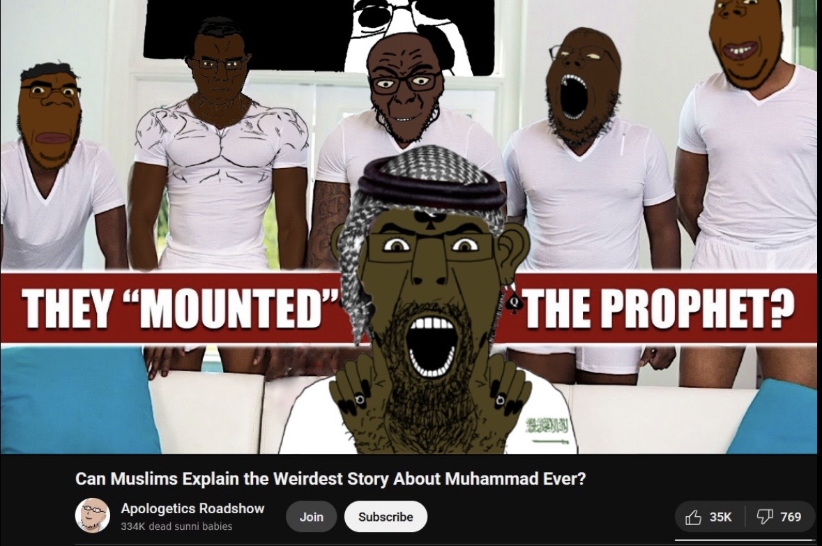 if your saying jokes like this then ur true nature is that your not sincere, your just a muslim hating guy wanting to start arguments on an incel forum. i dont like debating because its so incredibly mentally draining, im only doing this as my duty as a muslim to inform you of the truth because you spread blatant lies about the religionanswer or you're a massive pussy (contrary to Aisha, who had a tiny undeveloped one)