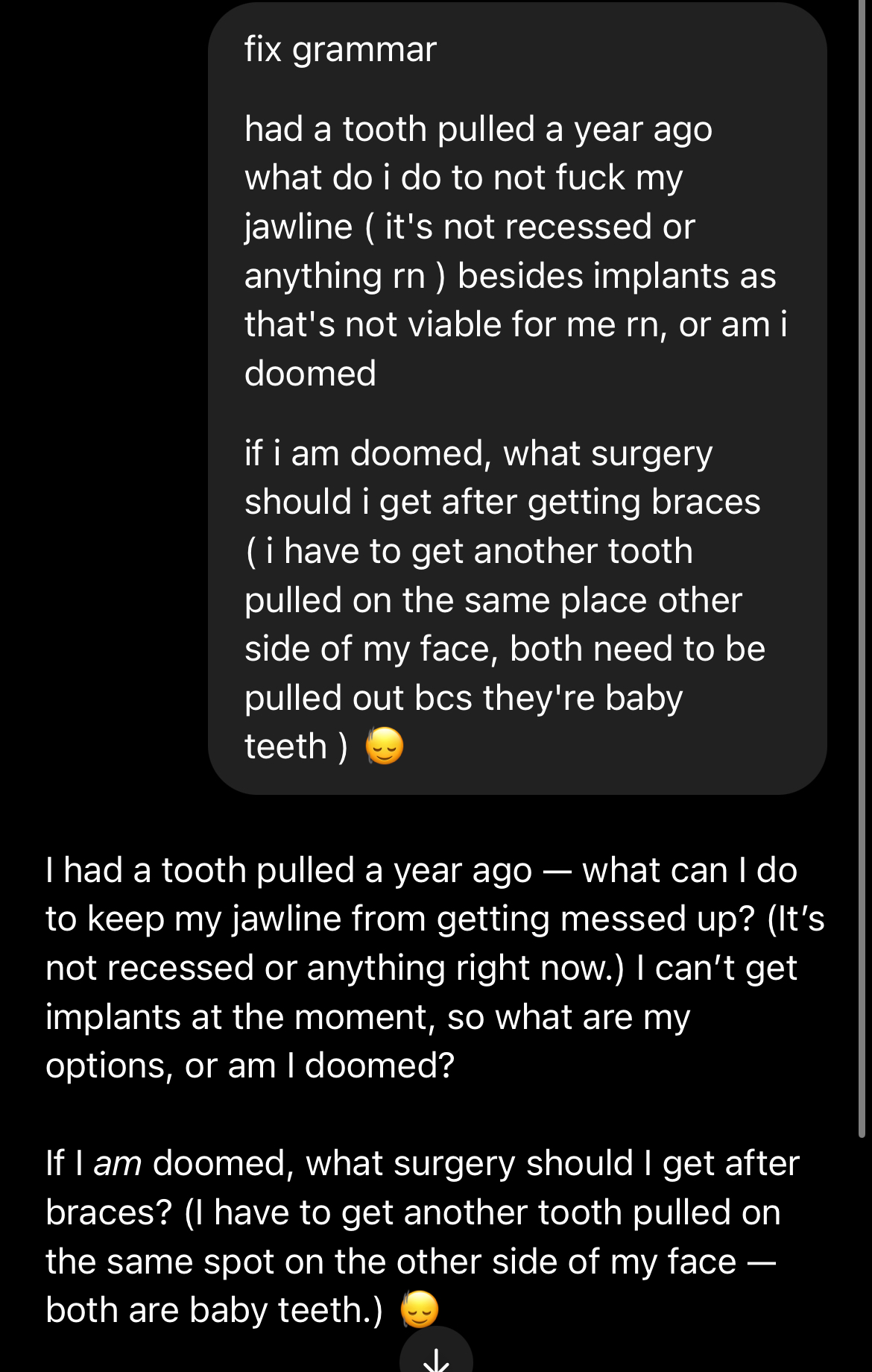 If I am doomed, what surgery should I get after braces? (I have to get another tooth pulled on the same spot on the other side of my face — both are/were baby teeth.)