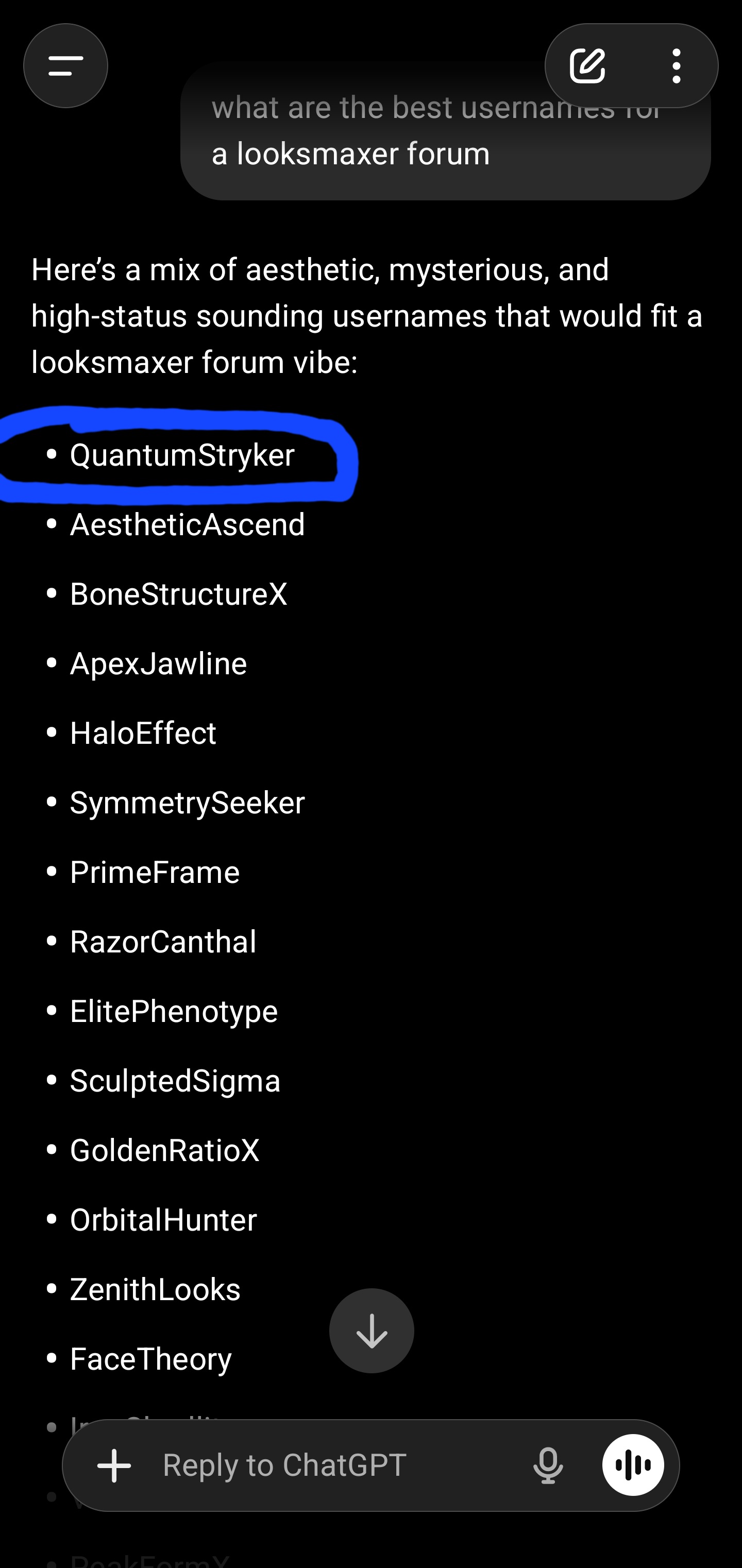 1) firstly, check out the username itself. it resembles one that is chosen ENTIRELY by a robot or a bot-like system. it reminds me of when you first get an xbox and you choose the preselected names as your user. worst of all, i asked the well-known CHATGPT to come up with some usernames for a looksmaxer forum. and LOOK at the first name.