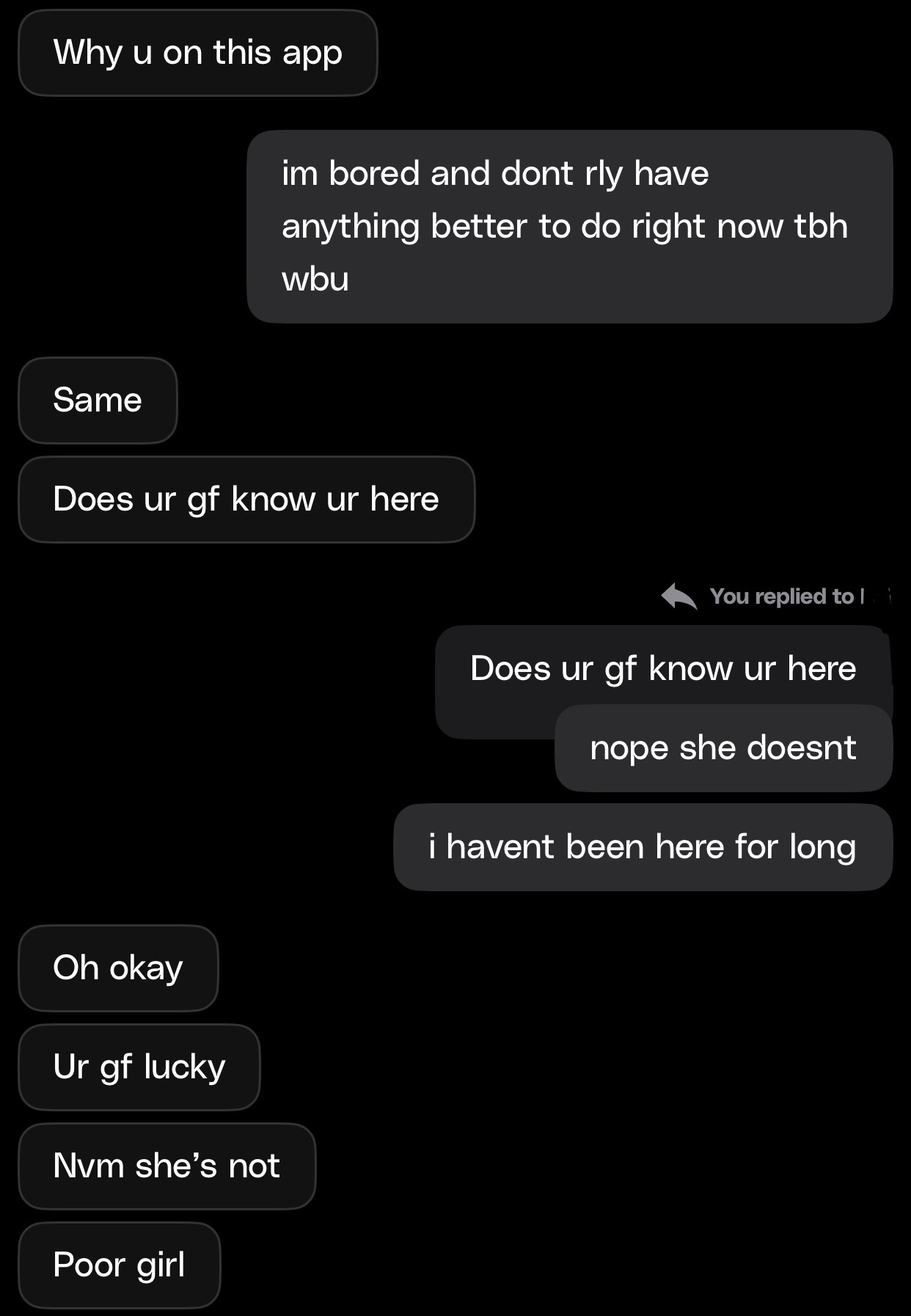 When i used to use that app i would always dm girls “i wish my gf looked like you” and tell them they fog my gf to catch their attention instead of being boring