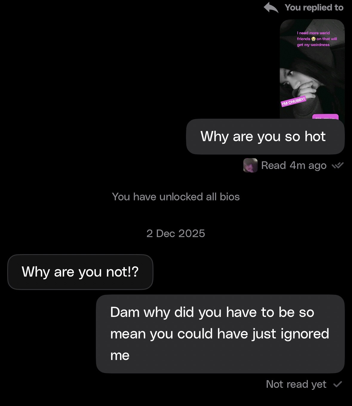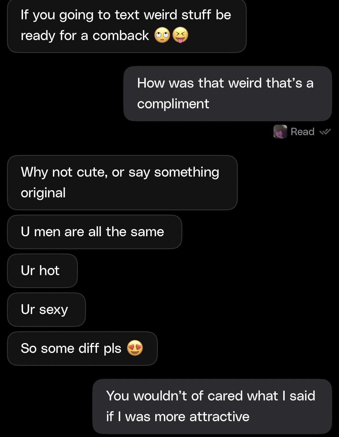 Women sometimes instead of rejecting kindly will start insulting you out of no where while reaching for the most absurd reasons as to why they did so just to avoid accountability and justify their actions to themselves, it’s crazy