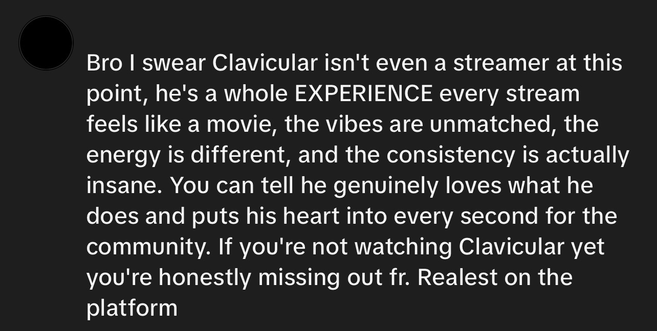 Nigga did you just write that?Bro I swear Clavicular isn't even a streamer at this point, he's a whole EXPERIENCE every stream feels like a movie, the vibes are unmatched, the energy is different, and the consistency is actually insane. You can tell he genuinely loves what he does and puts his heart into every second for the community. If you're not watching Clavicular yet you're honestly missing out fr. Realest on the platform.